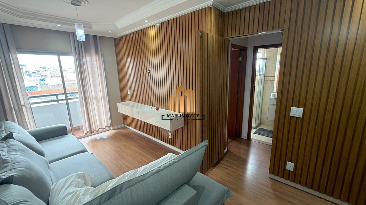 com 2 dormitórios (sendo um com armário), banheiro (com box blindex e gabinete), cozinha (com armários planejados, geladeira, cooktop, microondas), sala espaçosa para 2 ambientes (com sofá, painel ripado e rack), 2 Sacadas (com vista livre e ótima ventilação) e 1 vaga de garagem (coberta e fixa).